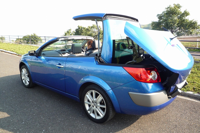 ルノーメガーヌカブリオレ(RENAULT Megane Cabriolet) ・世界初電動格納式ガラスルーフ スイッチ1つ、わずか22秒でフルオープンに。ルーフまでガラスなのでクローズド時でも室内は開放感一杯です。もちろんUVカットの強化ガラスですが、サンシェードも付いています。運転席と助手席はシートヒーター搭載ですので、積極的にオープンドライブを楽しんで下さい。 ・強化ガラス ヴィーナス40ガラス 新幹線のぞみや、汐留の電通本社ビルにも使用されています。世界シェアNo、1を誇るサンゴバン社製。高い耐久性と遮熱性が認められます。紫外線95%、赤外線78%をカットします。 ・安全性能は世界屈指 フルオープンボディとしては世界初のユーロNCAP最高評価の5つ星を獲得。 ESP(横滑り防止装置) EBA(緊急時ブレーキアシストシステム) 自動アンチロールオーバーバー(横転時、後部座席後ろのバーが瞬時に上がり、生存空間を確保します。) SRPシステム(エアバッグとシートベルトの衝撃緩和機構) 前席アンチサブマリンエアバッグ(衝突時に体がシートベルトの下に潜り込むのを防ぎます。) キセノンヘッドランプ 夜間走行もクッキリと視認性に優れ、安心です。 ・核家族にぴったりのオープンカー ISOFIXチャイルドシート対応リアシートで、小さなお子様も安全にお乗り頂けます。 ・トランクはとても広い オープン時では190リットルですが、ルーフを閉じた状態では490リットルもの容量を確保しています。トランクに荷物をたくさん詰め込んで、家族旅行にも行けます。 ・エンジンは扱いやすい 2,0 直列4気筒DOHCエンジン (可変吸気バルブタイミング)レスポンスの良い軽いタッチのエンジンです。マニュアルモード付プロアクティブ4速ATで、状況に合わせシフト出来、ドライビングを一層楽しいものにします。 ・マルチファンクションカードキー エンジンスタートボタン カードキーでスマートなスタート。カードキー挿入口は大きく出来ていますので、暗闇でエンジンキーを差し込む場所を探しイライラする事はありません。センターのスロットに差込み、大きなスタートボタンを押すだけです。イモビライザー(盗難防止装置)も付いています。 ・私的感想 ボディサイズは大きくなく運転もしやすいので、どなたにでも運転して頂けるクーペ/オープンカーです。普段は近所への買い物車としても活躍してくれる事でしょう。オープンカーは乗ってみたいけど、”幌が心配” ”トランクが狭い” ”普段は家族も運転するから” と言った方にお勧めの1台です。 内装のデザインもシンプルにまとまっており、シートの仕立てもしっかりと上質なものになっております。また、ボディカラーのプラチナムシルバーとワインのシートはオープンカーでは定番のコンビ。オープン時はスポーティーな印象を、クーペ時は落ち着いた印象を受けます。 但し、エンジン&ミッションはパワフルとは言いがたい物なので、”高速をハイスピードでカッ飛ばしたい”と言った飛ばし屋さんにはあまりお勧め出来ないかもしれません。(もちろん普通の高速走行は快適です。) ハンドルの切れはとてもよく、小回りがききます。ボディも四角く見切りもいいですし、後ろも大きなガラスですので後方視界も良好です。 日産とも提携している恩恵か、かつての頼りないフランス車の印象は薄く、内装などはどちらかと言うとしっかりとしたドイツ車に近い雰囲気です。ディーラーも全国各地にあるので、安心して乗れます。個人的にはクーペ時、ガラスルーフ部分のデザインが気に入っています。